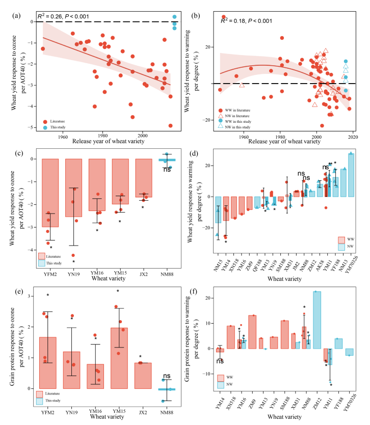 针对上述问题,研究团队在长江中下游麦区建设了首个田间开放式臭氧浓度和温度升高模拟平台(O3-T-FACE)。通过开展连续三年的田间原位实验,系统评估了当前主栽小麦品种在臭氧污染和气候变暖下的叶片光合速率、叶面积、生物量、籽粒产量、产量组成、蛋白质含量及氮素积累的响应特征。整合了已发表文献中的冬小麦产量和籽粒蛋白质对臭氧污染或气候变暖的响应结果,量化分析了小麦品种审定年份与其对臭氧浓度或温度升高耐受性的关系。同时收集长江中下游麦区的大田臭氧浓度升高或增温实验站点的结果,对比分析不同耐受性小麦品种生理性状的响应差异,揭示了抗性小麦适应臭氧污染和气候变暖的生理学机制。